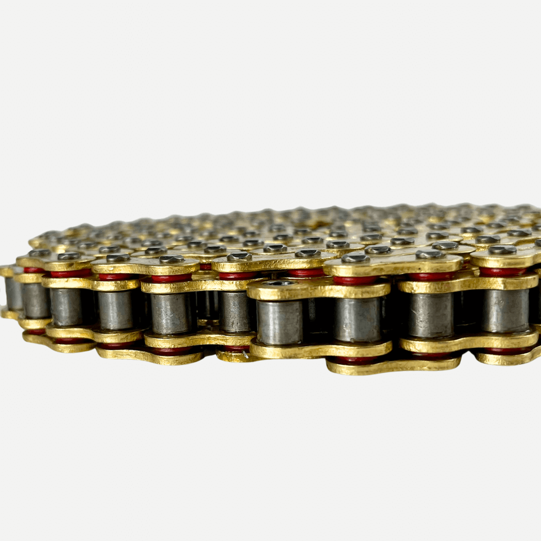 Con 140 eslabones reforzados y 4 remaches por eslabón, esta cadena proporciona una transmisión más suave y estable, ideal para motos de alto desempeño. Su acabado dorado no solo mejora la estética, sino que también ofrece protección anticorrosiva frente a la humedad y la fricción.