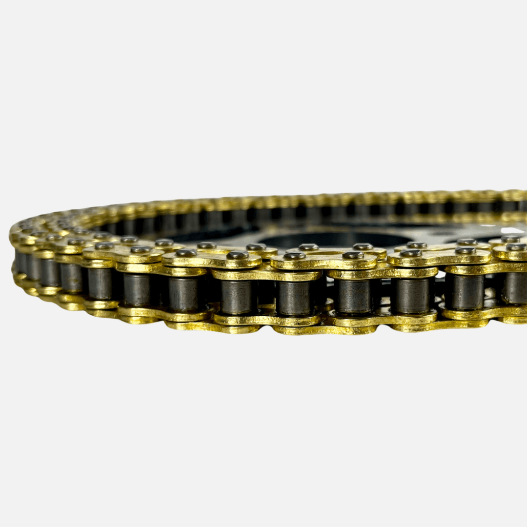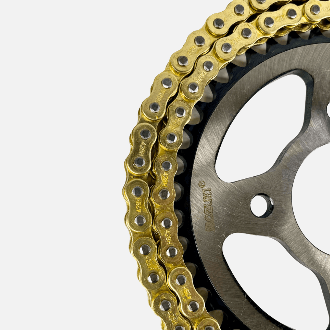 Su cadena 43T/15T 428H-130L garantiza un movimiento preciso y eficiente , reduciendo el desgaste y manteniendo una transmisión suave y confiable . Además, su acabado en color dorado no solo brinda una apariencia deportiva y moderna , sino también una capa adicional de protección anticorrosiva .
