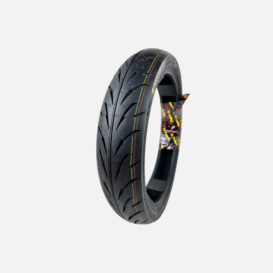 El neumático delantero está fabricado con materiales de alta calidad y una banda de rodadura diseñada para ofrecer el mejor desempeño en diferentes condiciones de manejo. Su excelente agarre en piso seco o mojado garantiza una conducción segura, precisa y estable, incluso en curvas o frenadas exigentes.