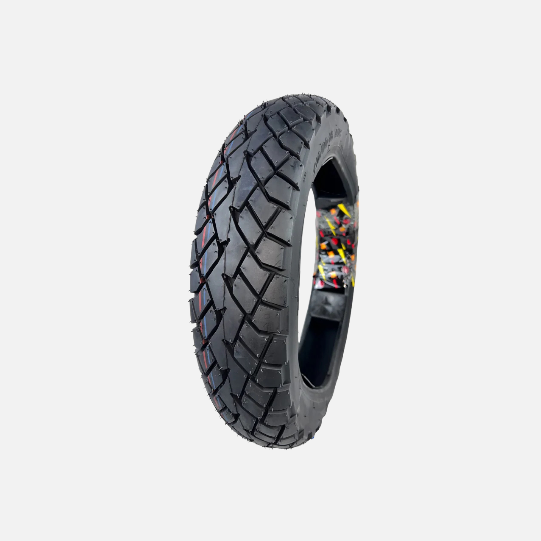 El neumático trasero está fabricado con materiales de primera calidad y una banda de rodadura diseñada para el máximo rendimiento , ofreciendo un excelente agarre en piso seco o mojado y una conducción estable y segura en todo tipo de terreno.