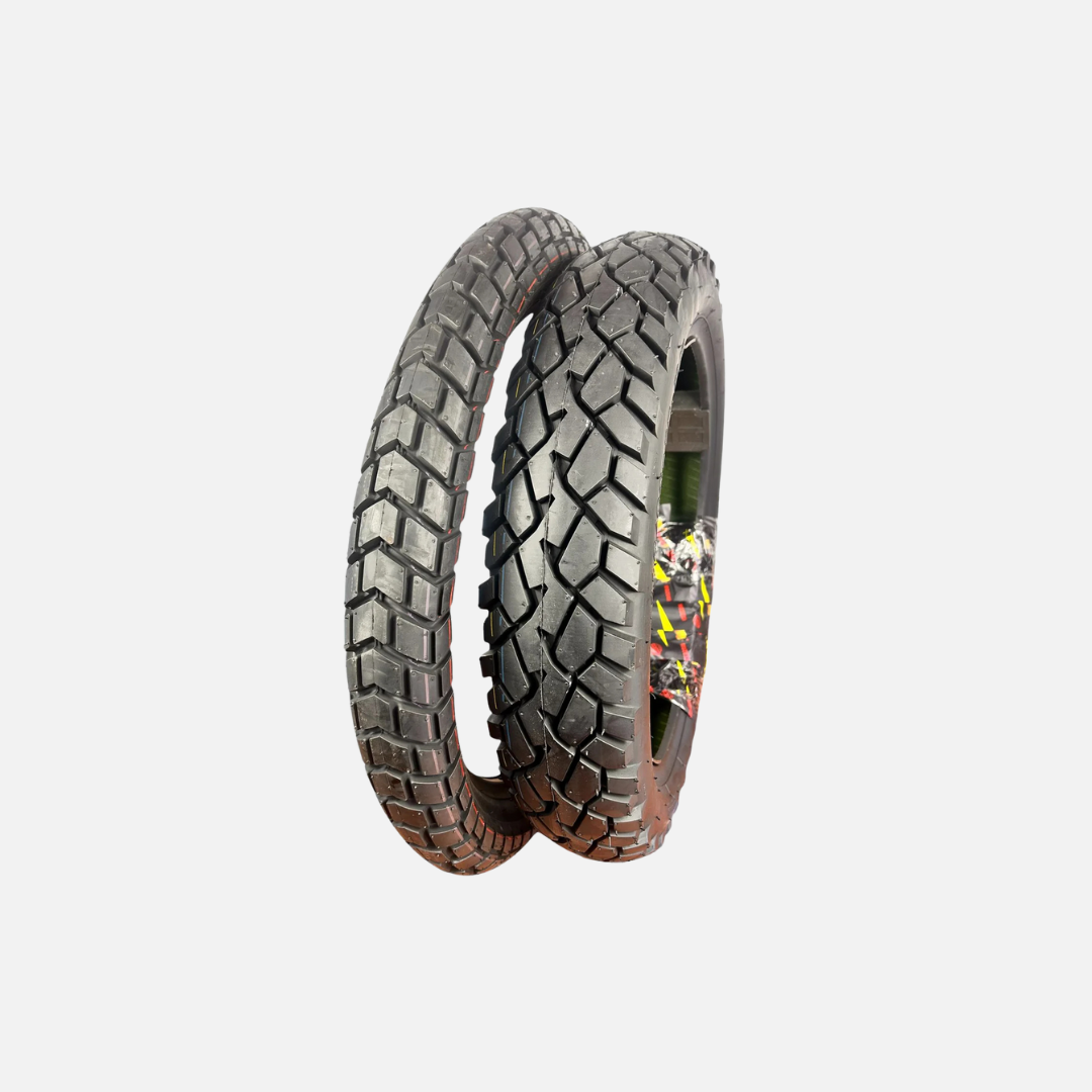 La pareja de neumáticos para moto ofrece excelente calidad de construcción y un gran agarre en superficies secas o mojadas, garantizando máxima seguridad y control en cada trayecto. Su diseño avanzado de banda de rodadura y su compuesto de goma de alto desempeño brindan estabilidad y tracción confiable tanto en asfalto como en caminos de tierra.